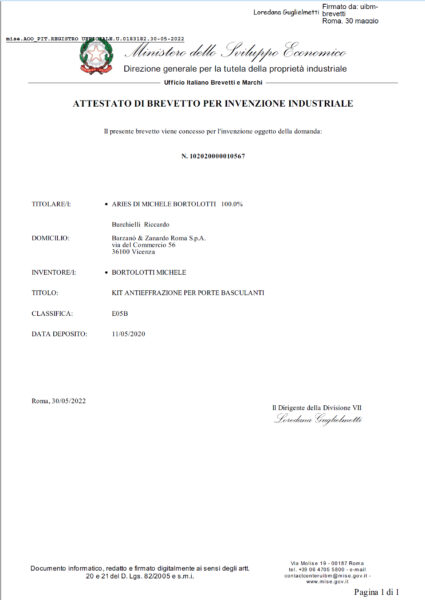 Michele Bortolotti è diventato titolare di un brevetto italiano che riguarda un kit antieffrazione per porte basculanti dei garage ed un sistema antisfondamento da applicare sulle serrature blindate di nuova generazione che sono venduti in tutta Italia.